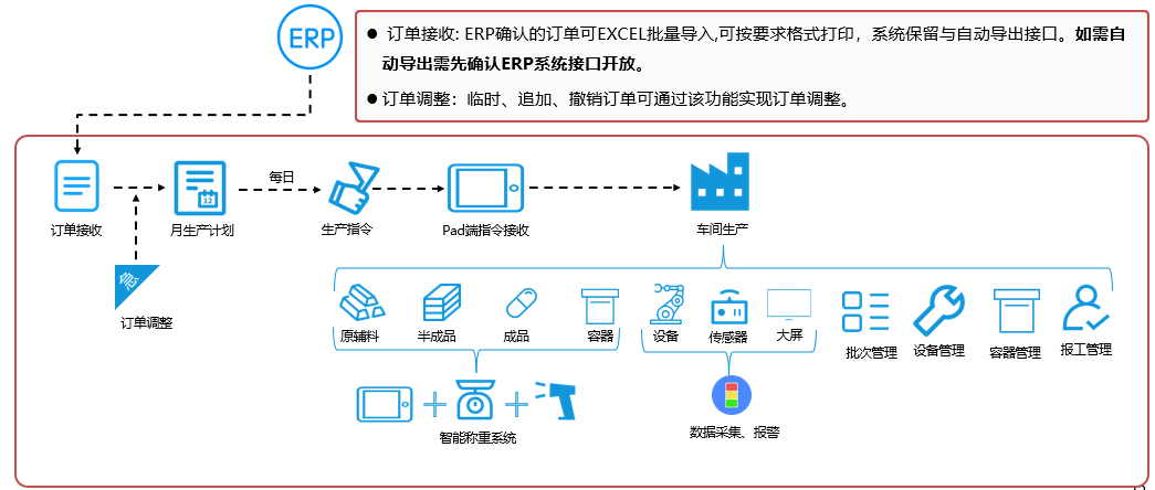 MOM系统将为企业生产现场提供包含生产管理、质量控制、设备监控、能源管理等功能。满足GMP/GSP和生产过程精细化管理的需要,进一步陷低生产运行成本;实现各类生产数据实时采集及信息共享,对生产过程实时监控,使生产车间现场生产透明化,逐步优化生产过程管理;将生产管理层、执行层、控制层之间的信息系统整合,实现生产过程全面信息化,促进生产制造管理向柔性化、自动化、精细化、敏捷化方向发展,提高生产线效率,降低生产成本,实现生产卓越运营。