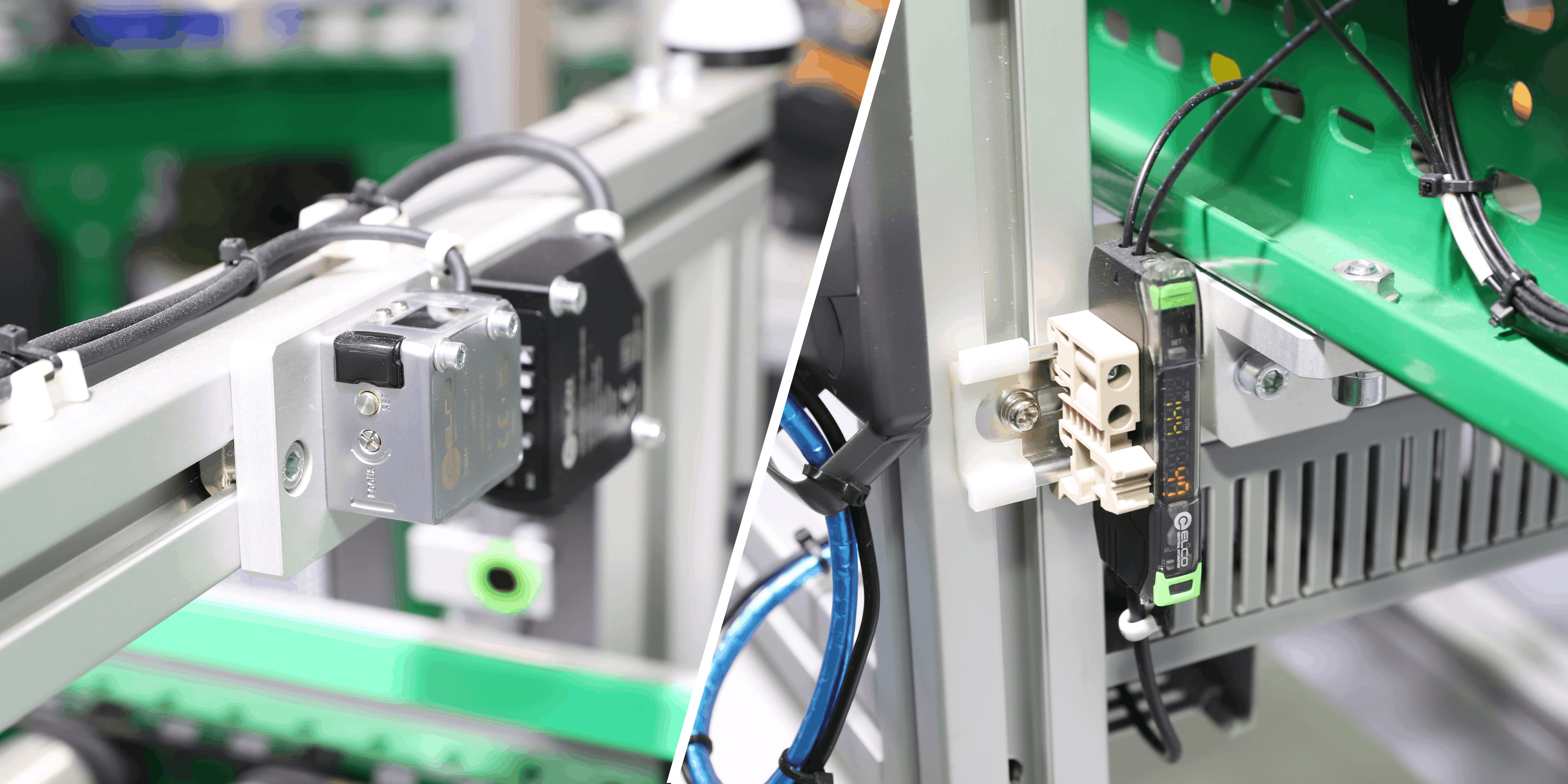 OSM47颜色传感器能高速识别包裹颜色或色标,亦可稳定区分货物流向,触发自动分拣,显著提升物流线的自动化水平与分拣准确性;OC10系列数字光纤传感器连接灵活、抗干扰强,能在恶劣环境或低反射率工况下确保稳定检测。