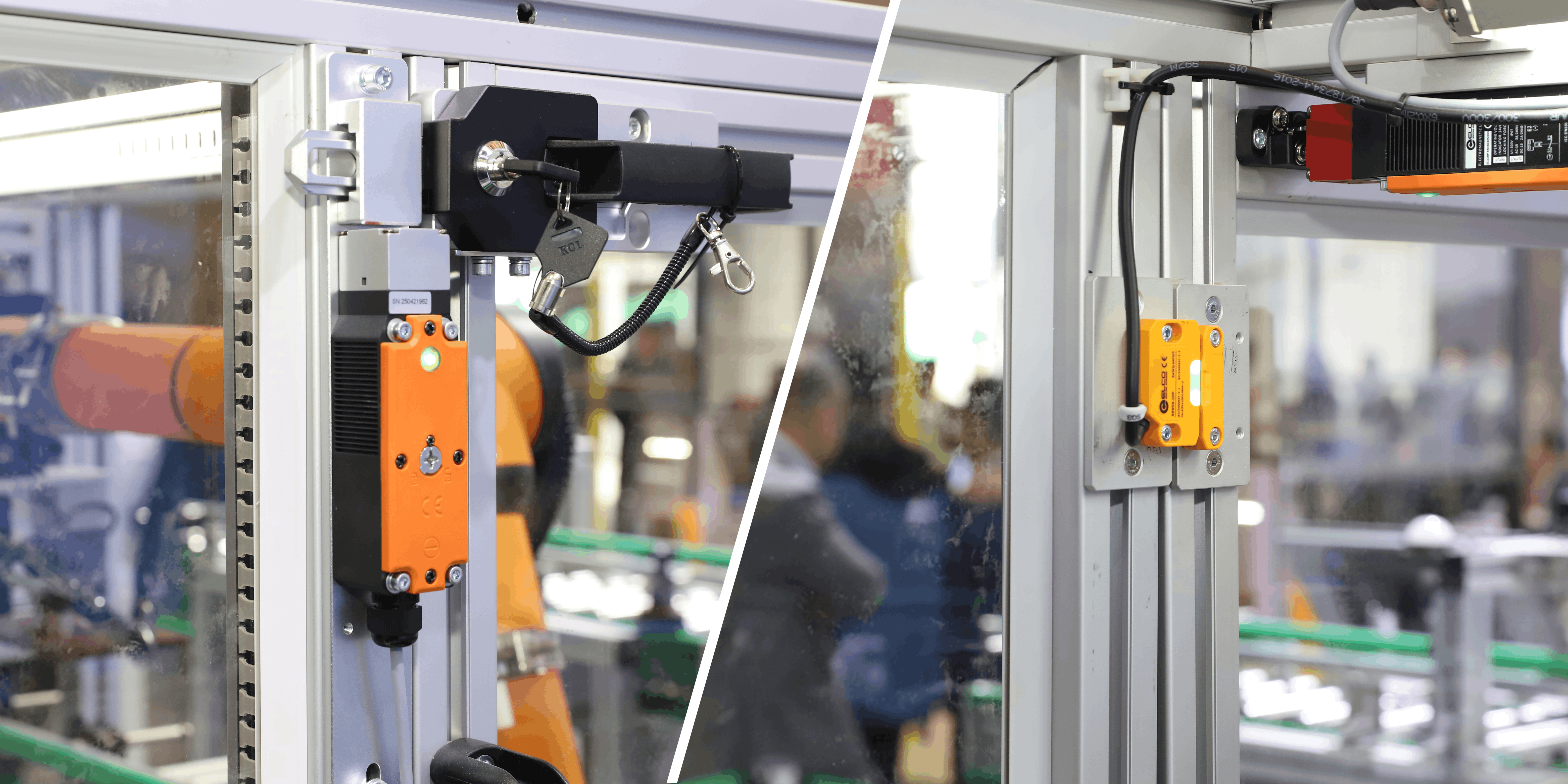 安全门锁与安全开关适配风险高发区,交叉带分拣机检修门配套使用SL110安全门锁及门栓,门未关闭锁定状态则设备无法启动;堆垛机围栏门安装SRW50 系列 RFID 安全门开关,当人员开门时堆垛机立即停机锁定。